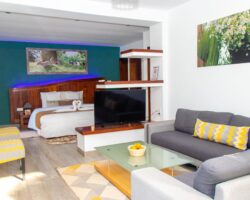 Chaque appartement s’ouvre sur une vue imprenable sur le jardin et la piscine, offrant ainsi un cadre idéal pour des moments d’évasion en famille. Avec son style contemporain, chaque résidence comprend une chambre avec un lit King Size, une salle de bain moderne et un vaste salon, incluant un coin salle à manger.